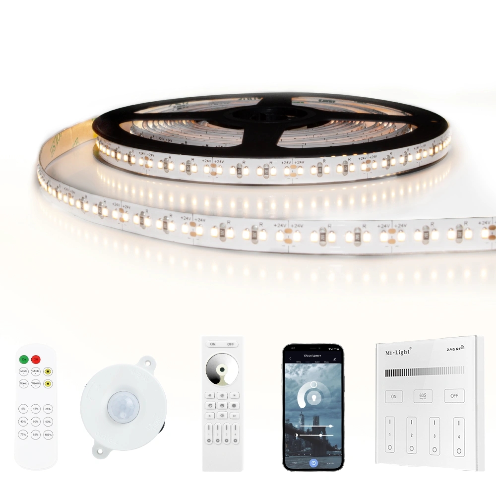 3 meter led strip helder wit pro 720 leds – 4000k – complete set deze complete set helder wit pro bevat alle benodigde onderdelen om uw led strip aan te sluiten en te bedienen. Door de 240 leds per meter ontstaat er een egale lichtlijn en hoge lichtopbrengst. Dat maakt deze led strip geschikt voor de veeleisende gebruiker. Kenmerken complete set helder wit pro 720 3 meter led strip uit één lengteinclusief bediening naar keuze pro: 240 leds per meter, type 2216 24 volt led strip helder wit 4000k dubbelzijdige 3m plakstrip op onderkant dimbaar met bediening naar keuze ook (spat)waterdicht verkrijgbaar (ip65/67) complete plug & play set deze led strip heeft een hoogwaardige, strakke lichtopbrengst. Helder wit biedt een rustig effect en is daarom een ideale keuze voor wie zoekt naar neutrale led verlichting die de kleur van de ruimte of het verlichte object minimaal beïnvloedt. Helder wit pro wordt dan ook vaak gebruikt voor zakelijke doeleinden. Door de cri waarde van >90 is de belichting kleurecht. Bij de complete sets bieden we keuze uit diverse bedieningen, zoals een led afstandsdimmer of wandpaneel. Bovendien is het van belang om na te denken over de waterdichtheid. Als de led strip nat kan worden raden we u aan te kiezen voor één van de (spat)waterdichte coatings: ip65 (spatwaterdicht) of ip67 (waterdicht). U kunt voor advies altijd contact met ons opnemen.