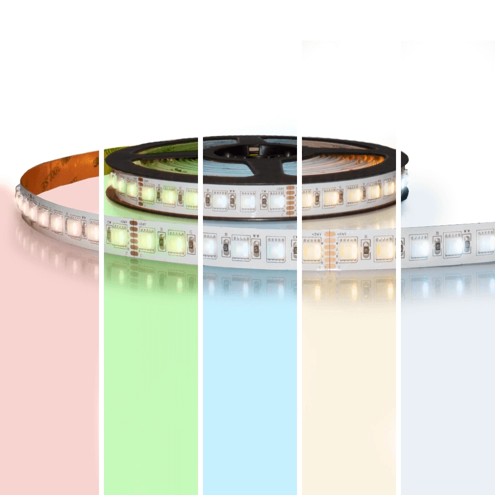 3 meter RGBWW led strip pro – losse strip de RGBWW led strips pro met leds van het merk epistar zijn van zeer hoge kwaliteit. Ze zijn uniek vanwege het hoge aantal leds per meter. Dit zorgt voor een hoge lichtopbrengst, welke vanzelfsprekend instelbaar is indien u beschikt over een geschikte controller. Het gaat om kwalitatieve leds van het type 5050 5-in-1. Kenmerken losse RGBWW pro led strip RGB + warm én koud wit96 leds p/m, type 5050 5-in-1keuze uit ip20, ip65 en ip67 coatingsdimbaar24 volt professionele led strip3m dubbelzijdige plakstrip aangehecht deze multicolor RGBWW, ofwel RGB+cct led strip pro is geschikt voor kieskeurige consumenten die op zoek zijn naar een gekleurde led strip van hoogwaardige kwaliteit, óf voor de zakelijke klant welke hem gebruikt voor professionele toepassingen. Het merk epistar garandeert hoogwaardige kwaliteit, en de 96 leds per meter zorgen voor een fraaie, egale lichtlijn. U heeft bij deze led strip keuze uit 3 coatings. Ten eerste kunt u kiezen voor een stofdichte ip20 coating. Voor contact met water zijn de ip65 (beschermd tegen waterstralen) of ip67 (waterdicht) coatings geschikt. Onze led strips zijn standaard voorzien van stevige, dubbelzijdige 3m tape en aansluitstekker aan beide uiteinden. Heeft u tevens led strip accessoires zoals aansluitmateriaal en bediening nodig bij uw led strip? kijk dan eens bij de complete sets RGBWW pro.