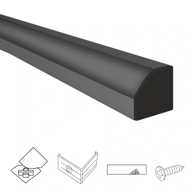 4 meter zwart led strip hoekprofiel basic line – breed model – inclusief afdekkap en bevestigingsmateriaal dit zwarte led profiel is specifiek bedoeld om in een hoek te plaatsen. Dat wil dus zeggen dat u dit zwarte hoekprofiel bijvoorbeeld op de scheiding van een wand en plafond kunt plaatsen. door de breedte van 30 mm kunt u eigenlijk iedere ledstrip in dit profiel plaatsen. U kunt kiezen uit een zwarte en semi-transparante afdekkap. Deze afdekkap zorgt ervoor dat u de leds niet afzonderlijk zult zien, waardoor er een diffuus lichtschijnsel gecreëerd wordt. Kenmerken led hoekprofiel zwart voor ledstrip afdekkap die zorgt voor een fraai, diffuus lichtkeuze uit een zwarte of semi-transparante afdekkapafdekkap eenvoudig in het profiel te klikken goede warmteafvoerhoogte van 30 mmbreedte van 30 mm eenvoudige montage met clips stevig aluminium van hoogwaardige kwaliteit dit zwarte hoekprofiel is eenvoudig te monteren met bevestigingsclips en is gemaakt van hoogwaardig aluminium. U heeft de keuze uit een zwarte of semi-transparante afdekkap. geen gedoe meer met het inschuiven van de afdekkap, aangezien u kunt de afdekkap handig in het profiel kunt klikken. De hoogte van dit led profiel is 30 mm en zorgt ervoor dat u de afzonderlijke ledjes van de ledstrip niet meer kunt zien.  er zijn zeer veel mogelijkheden met dit zwarte led hoekprofiel. Onder de keukenkastjes als functionele verlichting is bijvoorbeeld een veel voorkomende toepassing. Ook wordt dit profiel veel gebruikt op de scheiding van een wand en een plafond. Het profiel zorgt ook voor een goede warmteafvoer van de ledstrip die in het zwarte profiel zit. Deze complete set bestaat naast het zwarte profiel ook uit eindkapjes, bevestigingsclips en een kunststof afdekkap montage-tip: de bevestigingsklemmen zitten stevig vast op het profiel. Zorg er tijdens montage voor dat de klemmen in één keer op de juiste plek bevestigd worden om krassen op het profiel te voorkomen.