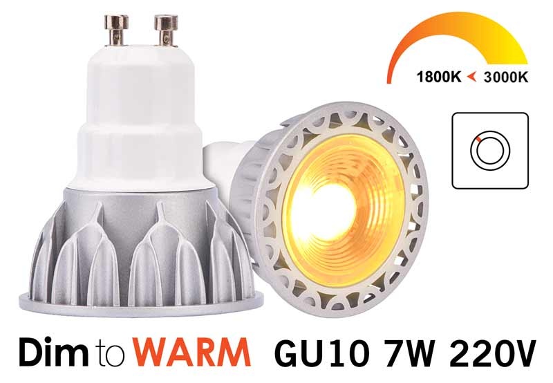 Dimbaar 7 Watt GU10 LED spotje met ‘Dim to Warm’ functie. Dit spotje geeft bij verder dimmen steeds warmer sfeervol licht. Past in ieder armatuur en werkt met iedere muurdimmer op 220Volt. Let Op! niet compatibel met MiLight of andere smart led systemen