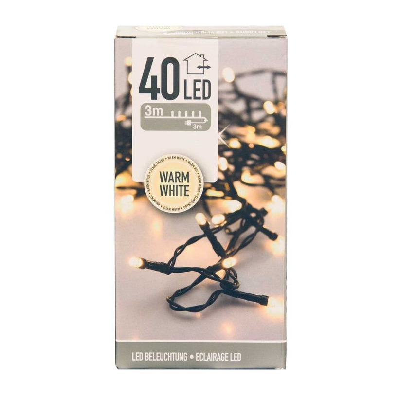 Kerstverlichting lichtsnoer met 40 warm witte led lampjes. Deze LED-kerstverlichting heeft 40 warm witte lampjes en is geschikt voor zowel binnen- als buitentoepassingen. Het lichtsnoer heeft een totale lengte van ongeveer 3 meter, wat het ideaal maakt voor het subtiel verlichten van kleinere kerstbomen, kransen, of andere decoratieve elementen. Het warme witte licht voegt een gezellige en feestelijke sfeer toe aan je interieur of exterieur.