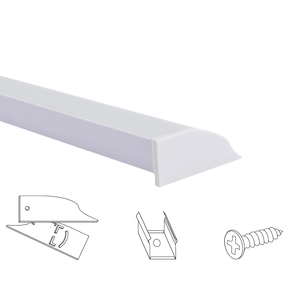 Led strip muur/plafond profiel met afdekkap – 1 meter voor montage op de muur of het plafond is dit led strip profiel met afdekkap geschikt. hiermee kunt u uw led strips op bijzondere wijze toepassen. Op allerlei ondergronden te gebruiken, en erg vriendelijk in gebruik. Kenmerken muur/plafond profiel van 1 meter aluminium profiel platte diffuse afdekkap voor 1 meter ledstrip ledstrip max. 12 mm dik voor muur of plafondmontage er zijn meerdere toepassingsmogelijkheden mogelijk met dit aluminium led strip profiel. U kunt er plafondkoof-verlichting mee creëren door hem tegen de muur te monteren, met de led strip schijnend richting het plafond. Maar ook tegen het plafond met de led strip schijnend richting de muur. Het is bovendien zeer fraai om hem bijvoorbeeld halverwege de muur te monteren in een strakke lijn. Hiermee creëert u een charmante horizontale of verticale gloed op uw wand. En wellicht heeft u zelf nog veel betere ideeën. Het led profiel is voorzien van frosted afdekkap voor diffuus licht. Daarnaast ontvangt u bevestigingsmateriaal en afdekkapjes voor de afwerking van de uiteinden.