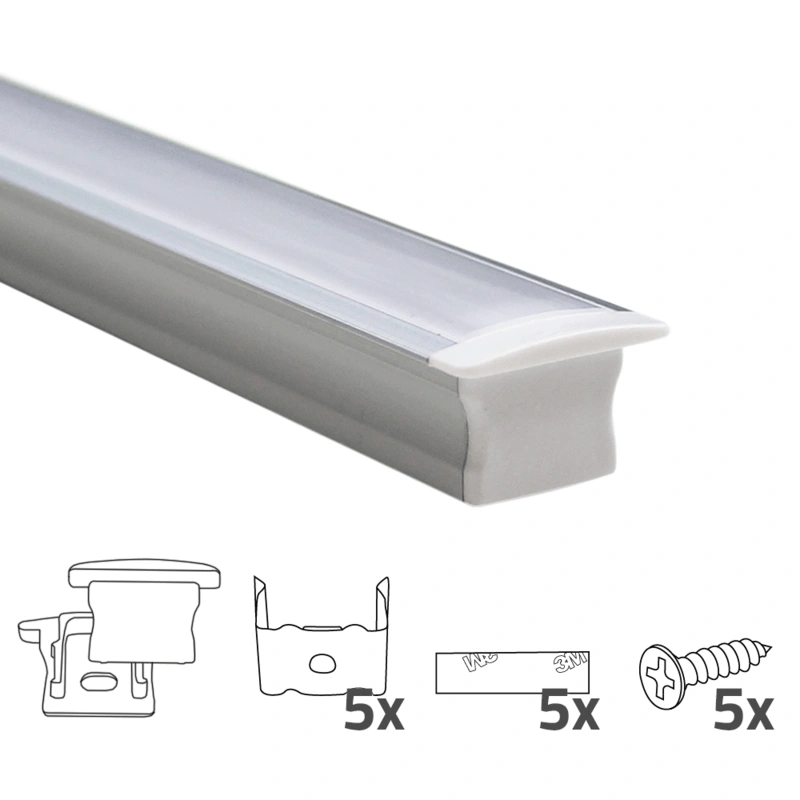2 meter led strip profiel inbouw – hoog model – inclusief afdekkap en bevestigingsmateriaal onze inbouw profielen zorgen ervoor dat u uw ledstrips in het geheel weg kunt werken en tóch die mooie, diffuse verlichting creëert. De hoogte van dit inbouw profiel zorgt in het bijzonder voor een egale en strakke lichtlijn door de vergrote afstand tussen led strip en afdekkap. Kenmerken 2 meter led profiel inbouw hoog voorzien van 2 meter lange, matte afdekkap 2x 1 meter aluminium profielstrakke en egale lichtlijn door matte cover goede warmtegeleiding hoge kwaliteit aluminium profielen eenvoudig te installeren door klikbare afdekkap onze inbouw led profielen worden gebruikt om led strips in zijn geheel weg te werken, bijvoorbeeld in traptreden, kasten of plafonds. De hoogte van dit inbouw profiel (15mm) biedt diverse voordelen. Allereerst zorgt de ruimer genomen inbouwdiepte ervoor dat er meerdere soorten led strips in het profiel passen, ook waterdichte varianten. Daarnaast staat de afdekkap verder van de led strip af wat ervoor zorgt dat het led licht meer verspreid wordt en de led lichtpunten minder of helemaal niet meer zichtbaar zijn. Ideaal wanneer het aantal leds per meter niet zo hoog is, dit valt met hoge inbouw profielen alsnog niet op. Uniek aan onze led profielen is de 2 meter lange afdekkap, een aaneengesloten matte cover die ervoor zorgt dat het led licht zo mooi weergegeven wordt. Doordat de afdekkap uit één geheel bestaat zijn er geen naden zichtbaar. De afdekkap is klikbaar, waardoor u deze eenvoudig op de geïnstalleerde aluminium profielen klikt, vooral bij inbouw led profielen een groot voordeel.