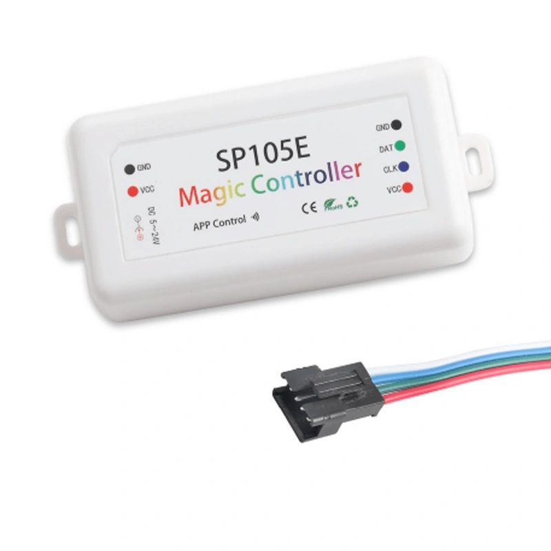 Magic controller – bedien uw digitale led strips via de app met de magic controller sp105e bedient u voortaan uw digitale WS2811 led strips met uw smartphone of tablet! de controller werkt via bluetooth en biedt dé oplossing voor bediening van dreamcolor WS2811 led strips. De controller sluit u direct aan op de usb led strip en verbindt u met de app via bluetooth.  kenmerken bluetooth controller verbinding via bluetoothbediening via app op smartphone of tabletapp is beschikbaar voor android en apple200 programma'ssnelheid en helderheid aanpasbaar de app is geschikt voor android en apple en is eenvoudig te gebruiken en geschikt voor de bediening van o.a. Dreamcolor WS2811 led strips. Via de app vindt u verschillende opties om de led strip WS2811 mee te bedienen. Zo heeft u de keuze uit 200 programma's, een aantal daarvan worden uitgelicht in de video. Tevens kunt u de helderheid en snelheid van de leds via de app eenvoudig aanpassen.  wanneer u de magic controller via bluetooth heeft verbonden aan uw led strip gaat u eerst naar 'settings' rechts bovenin. Hier selecteert u de optie brg: WS2811. Vervolgens kunt u aan de slag met het bedienen van uw led strip.