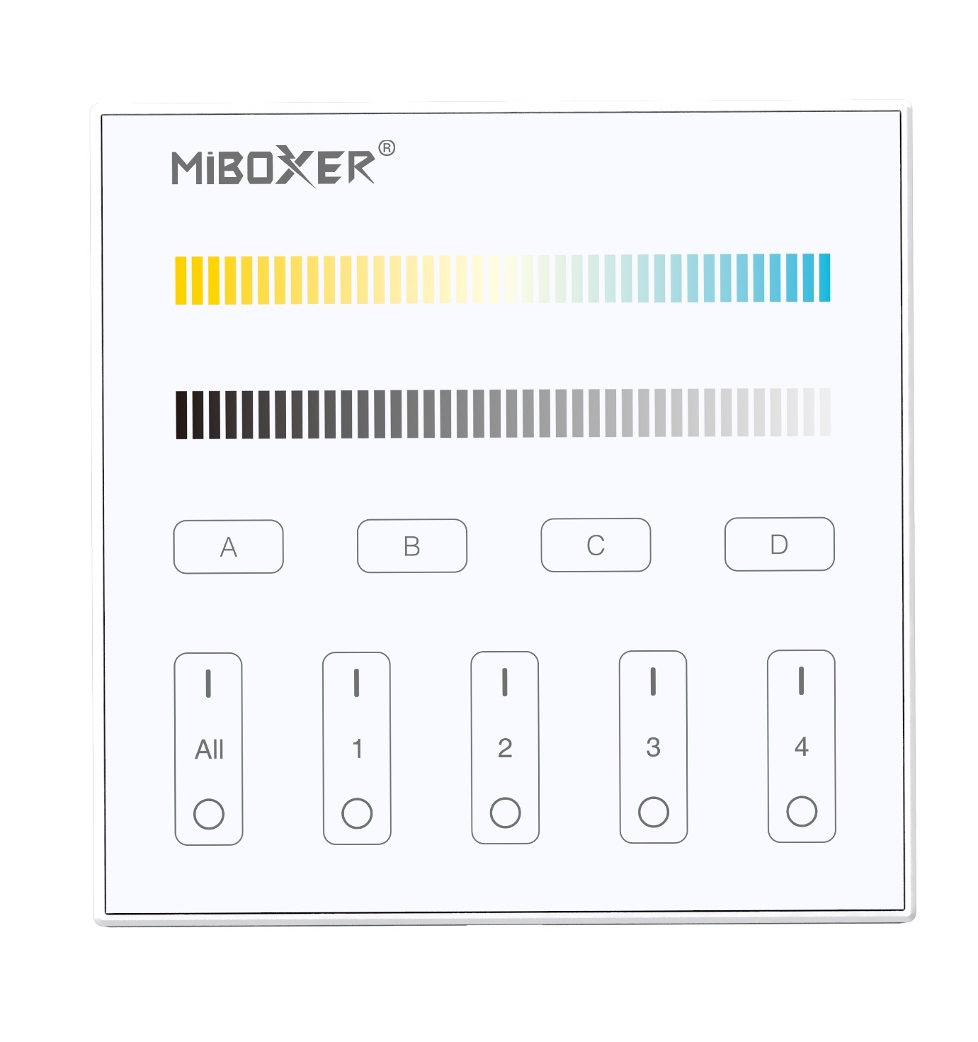 DALI DT8 4-zone Dual White / Color Temperature touch wandpaneel. Ondersteunt het nieuwste DALI 8 protocol wat het mogelijk maakt om over één seriële data bus 64 LED controllers of bedieningen op aan te sluiten.