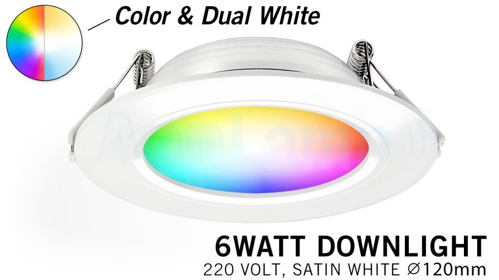 RGB kleur + Dual White LED 6W Mi-Light inbouwspots: RGB kleurregeling, kleurverzadigingsregeling en daarbij ook nog Dual White regeling van warm wit tot koud daglicht. Losse plafondspot. Bedienen via afstandsbediening, wandbediening of Wifi Box & app (apa