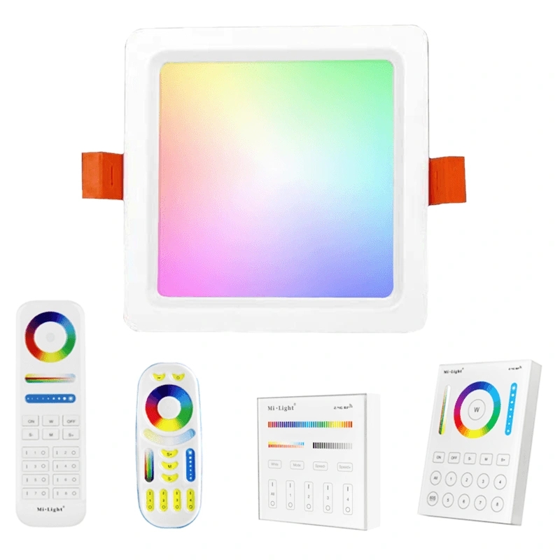 1-4 vierkante RGBWW led spots 9 watt – set met afstandsbediening maak uw keuze uit 1 tot 4 RGBWW inbouwspots én de gewenste bediening en profiteer van het gemak van milight wifi led verlichting. Rechtstreeks vanuit uw plafond waar deze inbouwspot zeer eenvoudig ingebouwd kan worden, beschikt u over een RGBWW (multicolor + dual white) kleurenpaneel waar u alle kanten mee op kan! kenmerken RGBWW downlight set met bediening complete set met 1 tot 4 inbouwspotsbediening naar keuzevierkant model inbouwspotvoorzien van adapter voor aansluiting op 220vbevat een 9 watt led lamp (1100 lumen)RGBWW: alle kleuren + instelbaar witbevestiging door klemmen, geen schroeven nodigdirect aan te sluiten op uw bestaande lichtpuntinbouwspot onthoudt laatste stand bij uitschakeling via wanddimmer RGBWW inbouwspots met de strakke en luxe afgewerkte RGBWW inbouwspots stelt u gemakkelijk elke gewenste kleur in, van RGB multicolor tot warm wit (2700 kelvin), koud wit (6500 kelvin) en alles daar tussenin. Warm witte verlichting dient hierbij als sfeervolle (doch krachtige) verlichting en is vergelijkbaar met het licht van een gloeilamp of een halogeenverlichting. Koud wit wordt gezien als een vorm van praktische verlichting en komt van pas wanneer u bijvoorbeeld een badkamer of keuken een moderne of strakke uitstraling wenst te geven. Wanneer u een in een bepaalde ruimte functioneel en krachtig licht nodig heeft dan kiest u bijvoorbeeld voor helder wit, ook dat is namelijk mogelijk. Als onderdeel van het slimme verlichting systeem zijn de RGBWW spots op diverse manieren te bedienen. U heeft hierbij de keuze uit bediening via uw smartphone of tablet (via de wifi module), afstandsbediening of via een wandpaneel. Naast reguliere aan/uit bediening kunt u de RGBWW inbouwspots ook dimmen, voor de perfecte ambiance. Kortom, de RGBWW inbouwspots zijn ideaal voor bedrijven, op kantoren, in bedrijfshallen, maar ook voor uw keuken, badkamer, garage of hal. deze vierkante inbouwspots zijn zeer eenvoudig te installeren gezien het feit dat ze beschikken over klemmen voor de bevestiging. Hierdoor heeft u geen schroeven nodig maar bevestigt u de spot eenvoudig in het montage gat met behulp van deze handige klemmen.