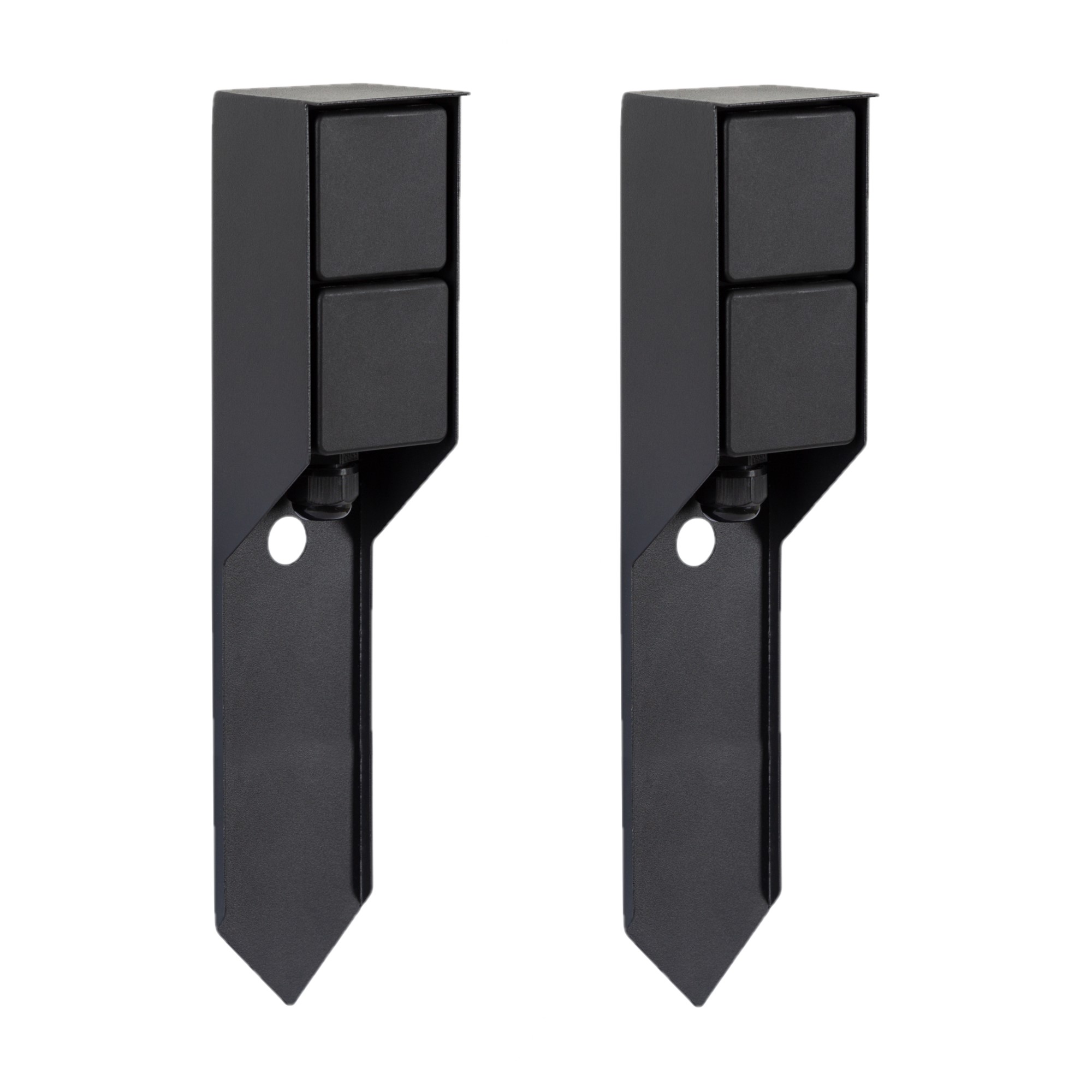 Een set van 2 tuinstopcontacten in de kleur zwart.De Double Spike van KS Verlichting is een strak vormgegeven, dubbel tuinstopcontact. Ideaal voor de buitenverlichting. De Double Spike is gemaakt van RVS en is afgewerkt in de kleur zwart. Het stopcontact voor buiten heeft een IP44 certificering en zelfsluitende klepjes voor de stroompunten en is hiermee veilig voor tuinverlichting te gebruiken. Erg handig aan de Double Spike: de geïntegreerde spie en gat voor de stroomkabel! Buitenstopcontact Double Spike heeft twee stroompunten en kan belast worden tot max. 3680 Watt. De wartel heeft een binnendiameter van 13mm.