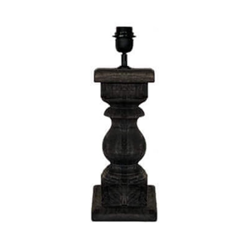 Stoer houten balluster lamp van 45 cm hoog in de nieuwe geblakerde zwart-grijze kleur.