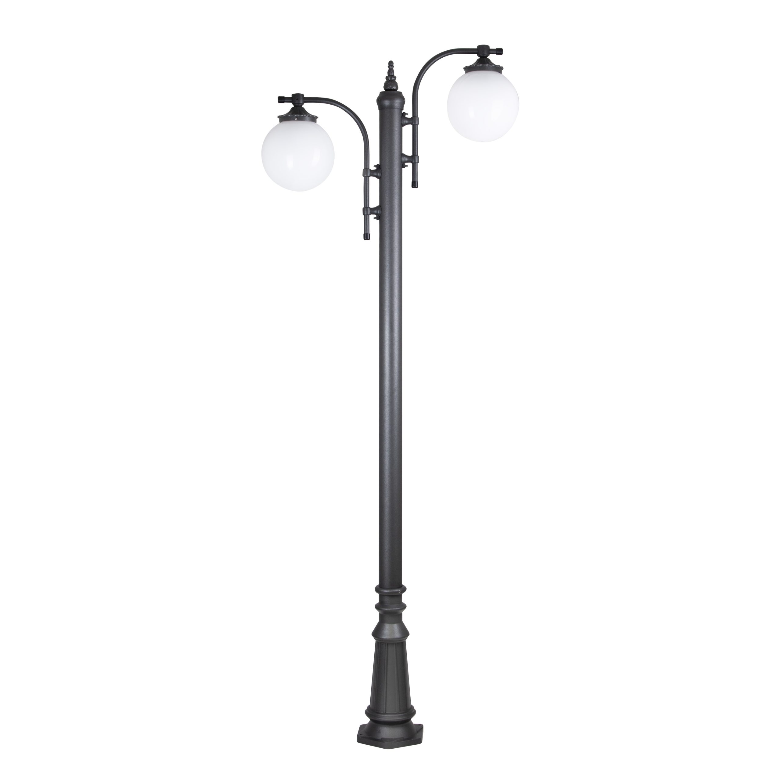 Twee lichts Tuinlantaarn, Madeira 2-lichts is een prachtige klassieke tuinlamp. Deze tuinlantaarn heeft een hoogte van 238 cm en is gemaakt van Aluminium. De tuinlamp is voorzien van een dubbellaagse poedercoating. De kunststof bollen zijn vervaardigd van een hoogwaardige kwaliteit Acryl en behoud zijn witte kleur. De lamp wordt geleverd met een E27 lamphouder. Dit maakt deze tuinlantaarn ook geschikt voor energiezuinige lichtbronnen waaronder LED. De bolvormige Madeira serie zorgt in de donkere uurtjes voor een bijzondere sfeer in de tuin en Creëert een prachtig licht- en schaduwspel.Let op! Dit product wordt op bestelling hand gemaakt, de levertijd van dit product kan oplopen tot 3 á 4 weken.